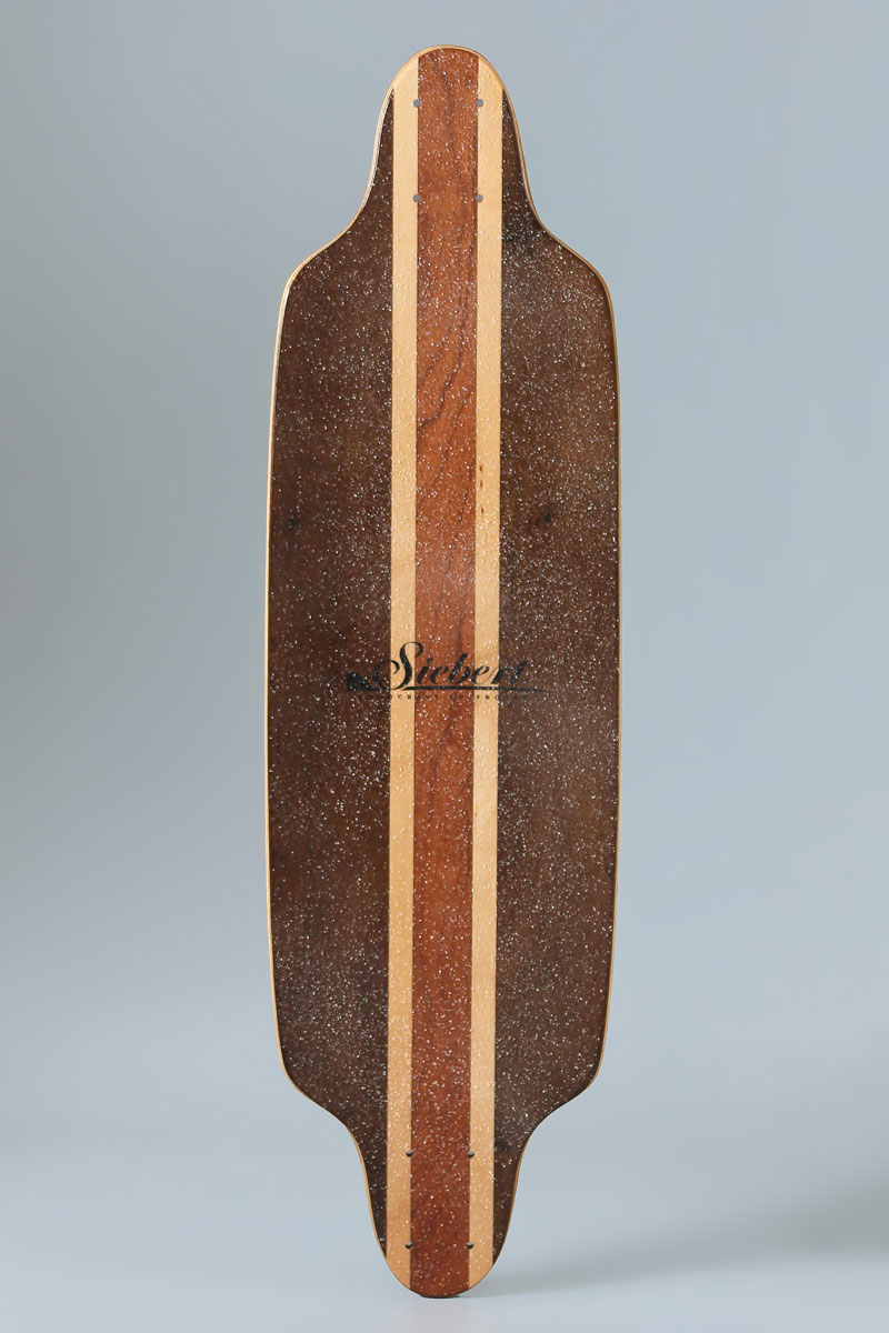 O deck é construído em madeira com marchetaria artesanal, utilizando Pinho, Imbuia e Cedro-Rosa, reforçado com fibra de vidro, resultando em um shape leve, com aproximadamente 1,3 kg, e ao mesmo tempo robusto.